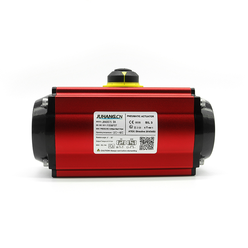 Siłownik pneumatyczny zębatego i zębnika podwójnie działający JHA0075DA jest zasilany sprężonym powietrzem, napędzanym prostym ruchem stojaka tłokowego w celu napędzania przekładni wału wyjściowego oraz wyjściem przez skok kątowy siłownika pneumatycznego. Powszechnie stosowane w zaworze kulowym, zaworze motyliowym, zaworze wtycznym i innym przełączniku zaworu skoku kąta i regulacji można również zastosować na inne okazje obrotowe, jest idealnym urządzeniem do osiągnięcia przemysłowej kontroli automatyki rurociągów.